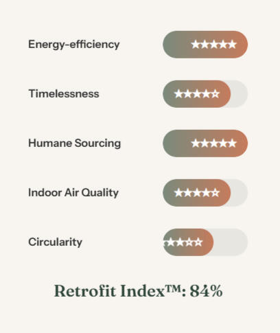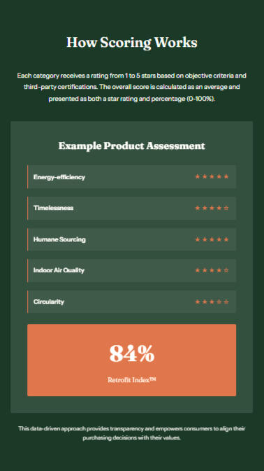 Our in-house five-pillar scoring system Retrofit Index™ is helping consumers and businesses evaluate sustainability in home products for an eco-conscious interior design transformation.